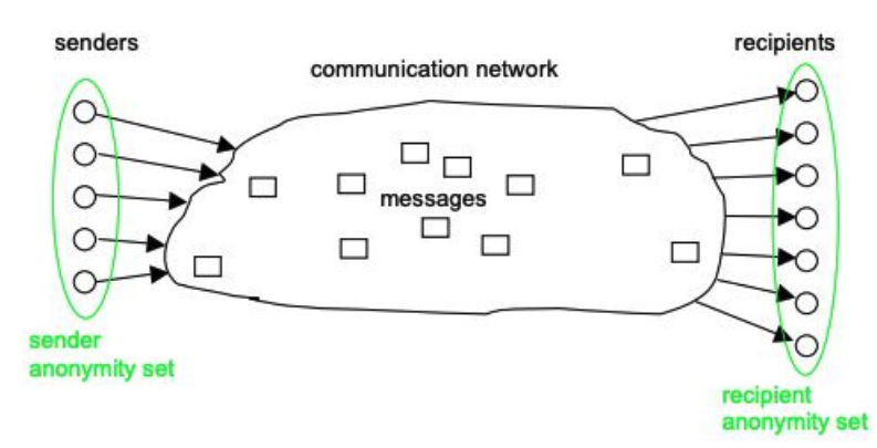 - Anonymity: sender & receiver anonymity which is formally defined as “The state of being not identifiable within a set of subjects, the anonymity set.”[1]