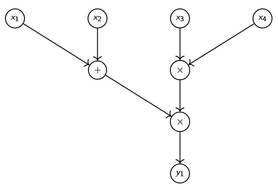 The following circuit represents y_1 = (x_1 + x_2)\cdot(x_3 \cdot x_4).