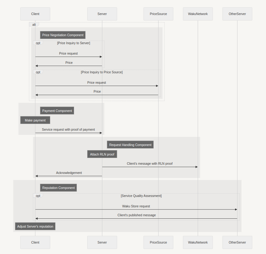 - Reputation (including Service Quality Assessment): the client assesses the quality of service and adjusts the server’s reputation.
