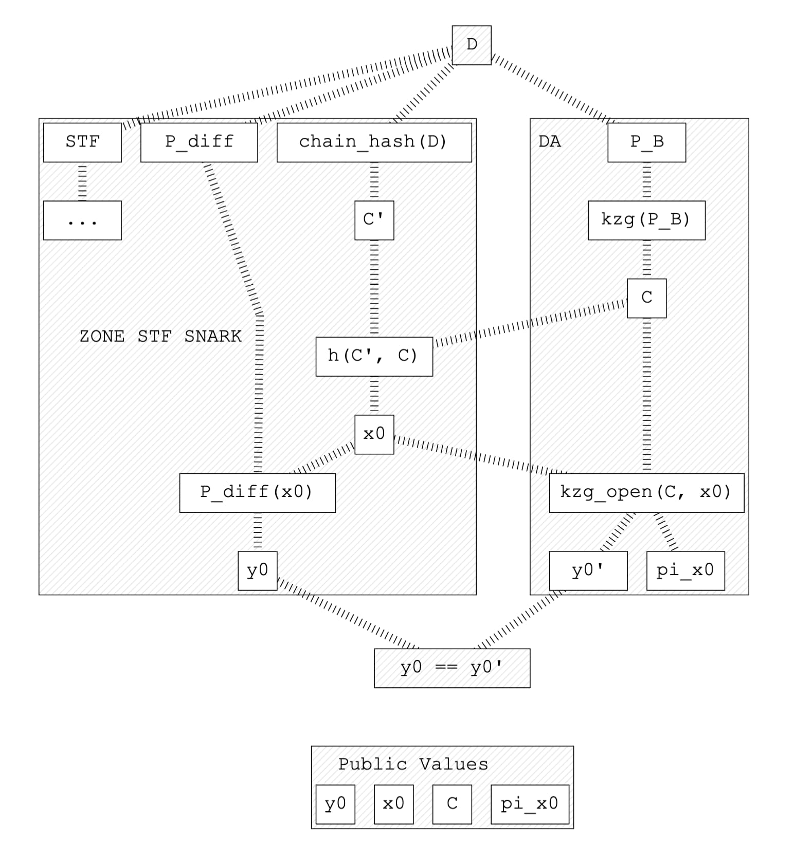 We need to prove that B (the data in the blob) is the same as the data used for the state diff within the ZK STF (state transition function) proof: