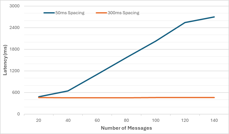 When a large number of (small-moderate size) messages are sent through gossipsub, the behavior is significantly influenced by the inter-packet spacing (delay). A smaller inter-packet spacing leads to a higher number of messages in the outgoing message queues, which in turn increases latency. For instance, the average message dissemination time can jump from 450ms to 2600 ms if the inter-packet delay is reduced from 350ms to 50 ms, as shown below.
