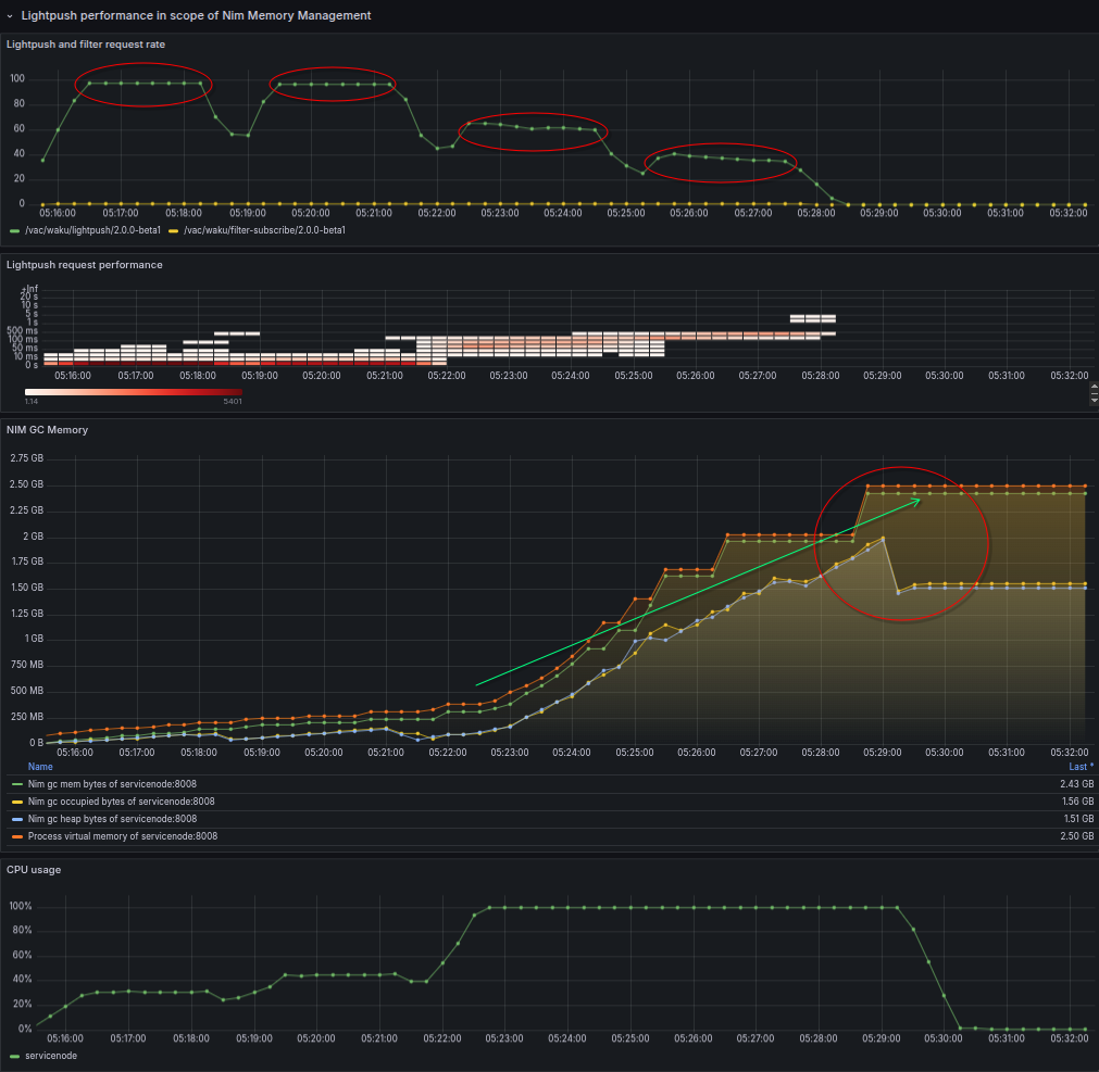 - In the second panel from the top we can see how response times of lightpush protocol are growing and combine with high CPU load.