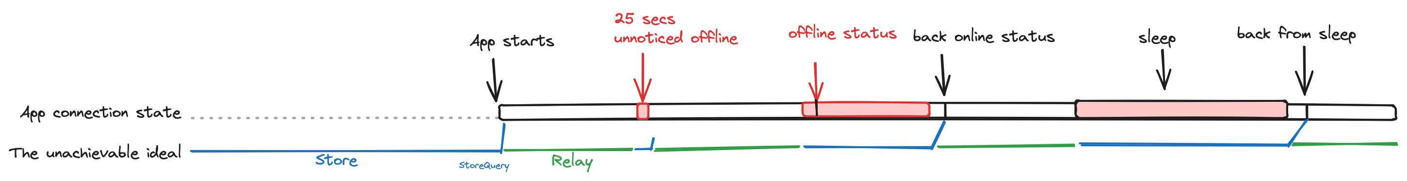 In the following picture we see at connection states for the app and how it receives the messages (blue: Store, green: Relay). when we are online (i.e.: minimally connected to peers for the pubsub topic), we are getting the messages realtime via Relay, for the periods that we are offline we are not receiving messages at all (obviously), but when we detect that we are back online we do a Store query for the time that we know we were offline. See the diagram below: