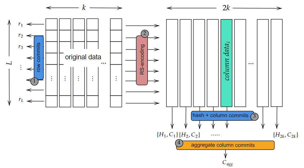 In this design, there are three different commitment calculations. The row commitment values are defined to ensure the RS encoding control of the data sent to storage nodes and the order binding of the relevant chunk value through the row commitment. The column commitment values guarantee the position binding in terms of rows in the data encoded by the Zone without the need for super nodes. Without this calculation, the Zone could change the row order of the data it holds enabling attacks on DAS. With these two commitment values, the positions of the original data on the x and y axes are bound.